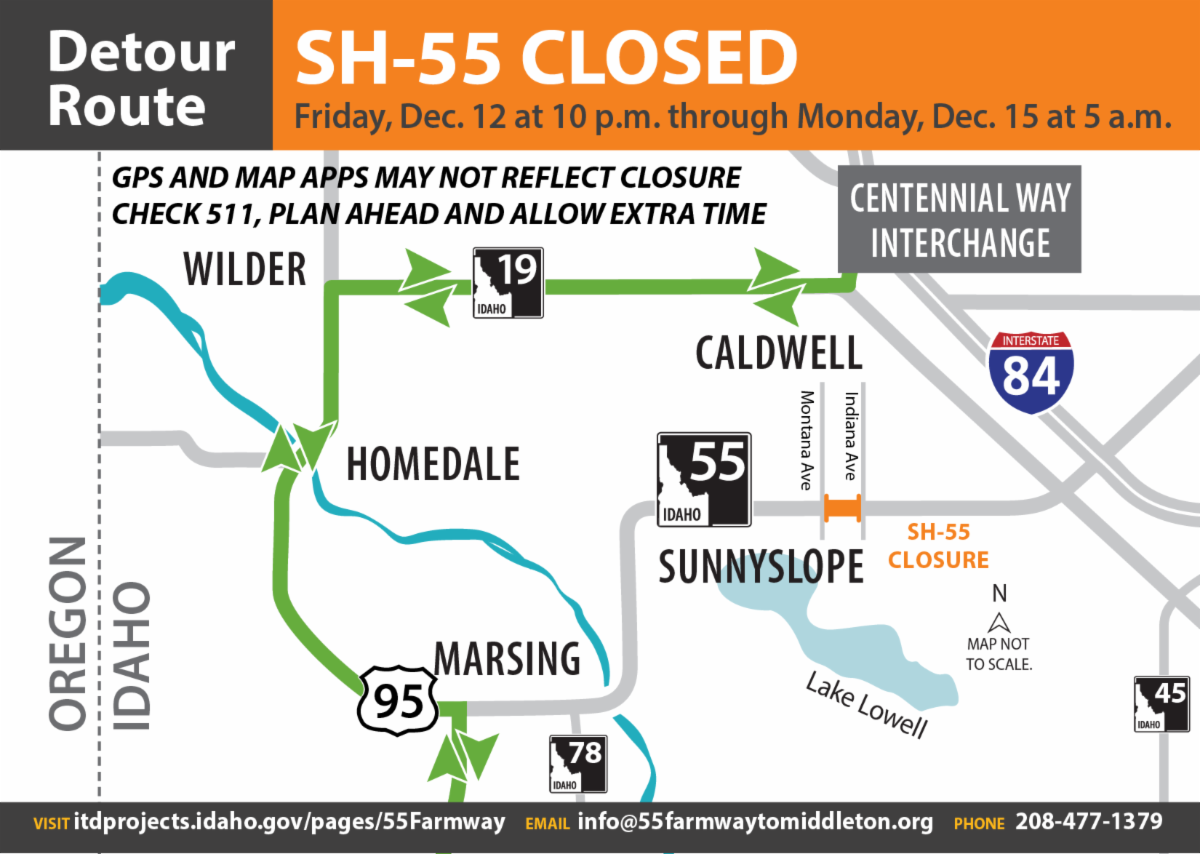 The Idaho Transportation Department will close State Highway 55 (Karcher Road) between Montana Avenue and Indiana Avenue this weekend. The closure will begin Friday at 10 p.m. with the highway reopening Monday at 5 a.m. This closure will allow crews to replace irrigation infrastructure just west of the SH-55 and Indiana Avenue intersection. This work is necessary before crews widen this portion of the roadway. The widening of SH-55 from Farmway Road to Middleton Road is anticipated to be complete by 2027.