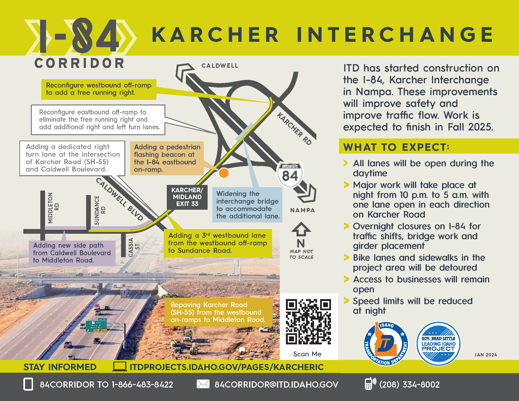 Email 84corridor@itd.idaho.gov. Call (208) 334-8002 with any questions or to schedule a meeting. Text 84CORRIDOR to 1-866-483-8422 for updates.