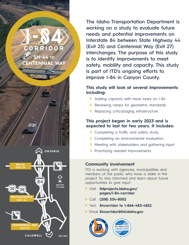 The Idaho Transportation Department is working on a study to evaluate future needs and potential improvements on Interstate 84 between State Highway 44 (exit 25) and Centennial Way (exit 27) interchanges.