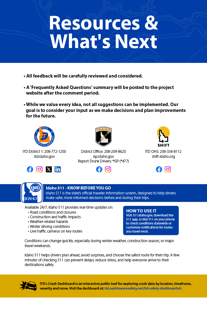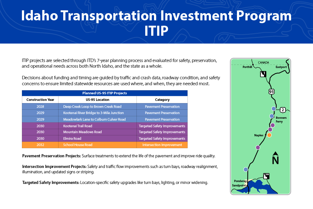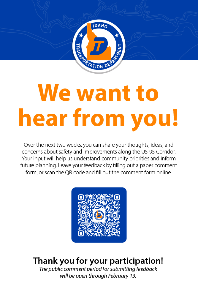 "This highway is essential to daily life in Boundary and Bonner counties. People who drive it every day know where the challenges are. Hearing those perspectives helps us better understand local concerns and identify areas that may deserve closer attention as we plan and prioritize our work."