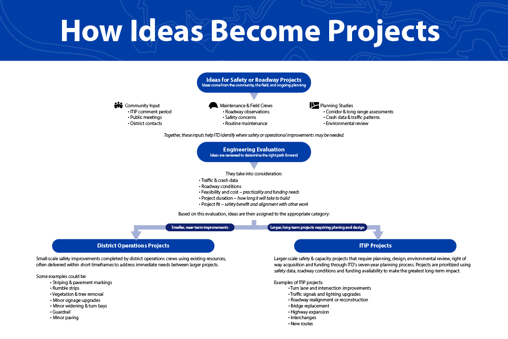 Overview of the ITD project planning cycle and maps out future projects programmed for construction along the corridor