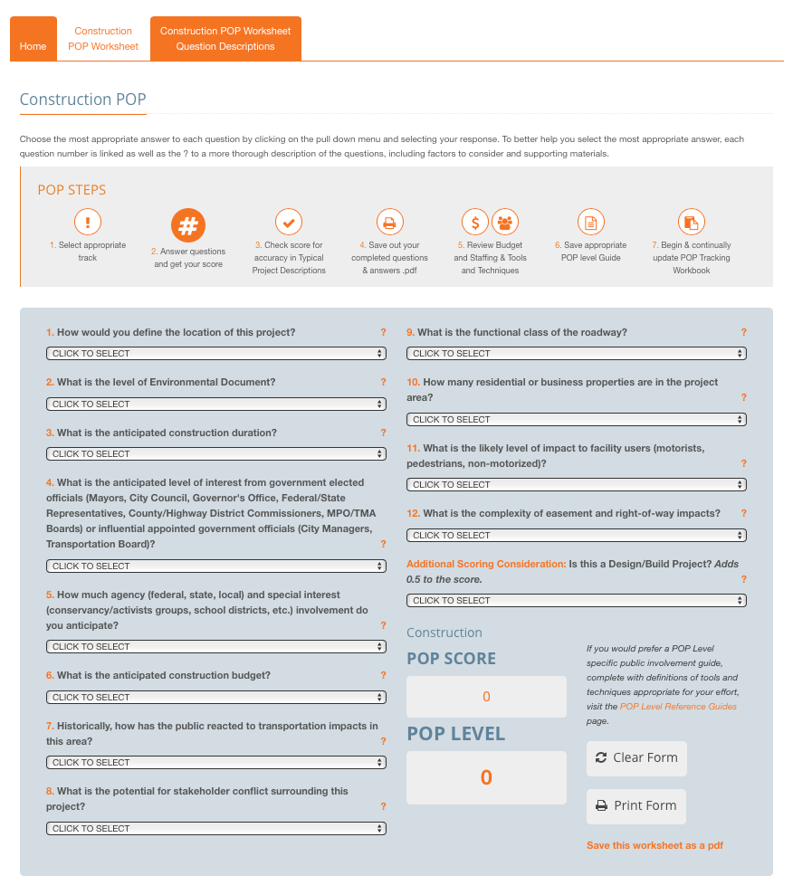 Roadway projects that are in or will be entering the construction phase. If your project is currently in construction or entering the construction phase, this track will help determine the appropriate level of public involvement prior to and throughout roadway construction efforts, including maintenance projects. Companion projects that fall within the same impact zone will likely be perceived by the public as one project, and should be combined into a single public outreach plan.