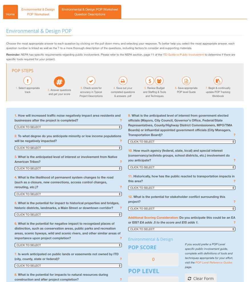 Public Involvement is mandatory in order to meet federal requirements. This Plannner is a guide to educating employees of the ITD staff to help them measure and gauge how much public involvement and public outreach should be done for our projects. It is not intended as a legally complete document to fully satisfy federal, state and local laws, rules and regulations. See Appendix 2 for a list of federal legislation, regulations and policies that guide public involvement in project development, and consult all existing state and local laws, rules and regulations for a complete view of state and local laws. Also, complete adherence with the procedures listed in this Planner may not be appropriate for all projects. More information about each is available on the ITD website.